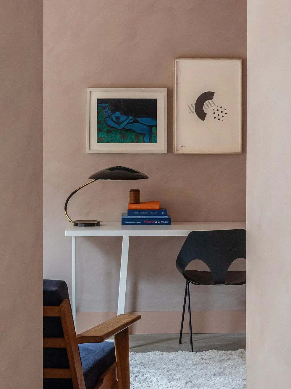 On the wall, its tone can appear more pronounced and pinker, adding a gentle warmth and subtle luminosity to the space. The shade feels light, refined and quietly expressive.