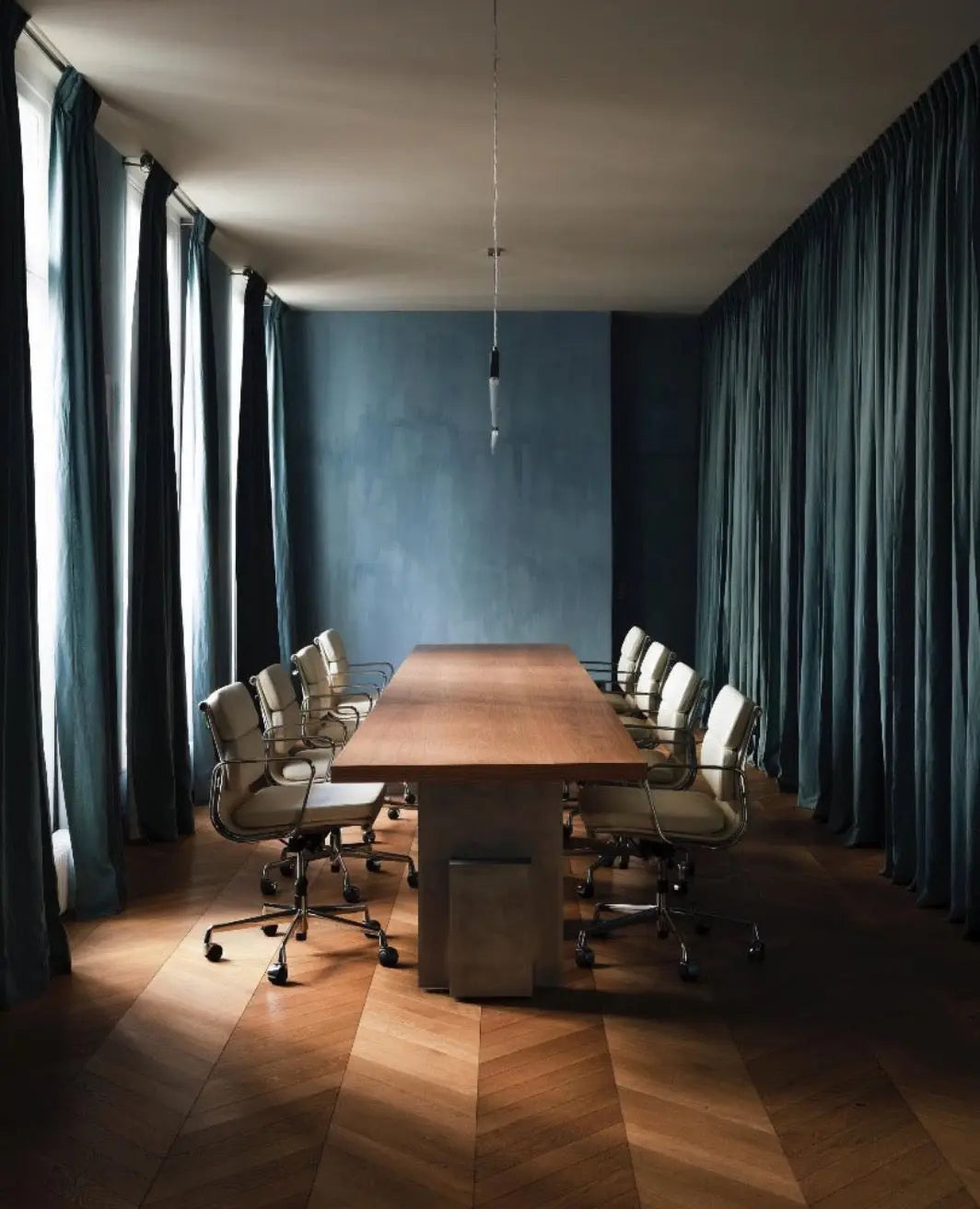Baltic is a sea-inspired blue limewash that brings clarity and freshness to any space. The colour appears more vibrant on the wall than on the Colour Card, making it an excellent choice for showrooms, offices, or retail interiors where focus and balance are key. A darker version is Columbine, and a greener alternative is Robin Egg.