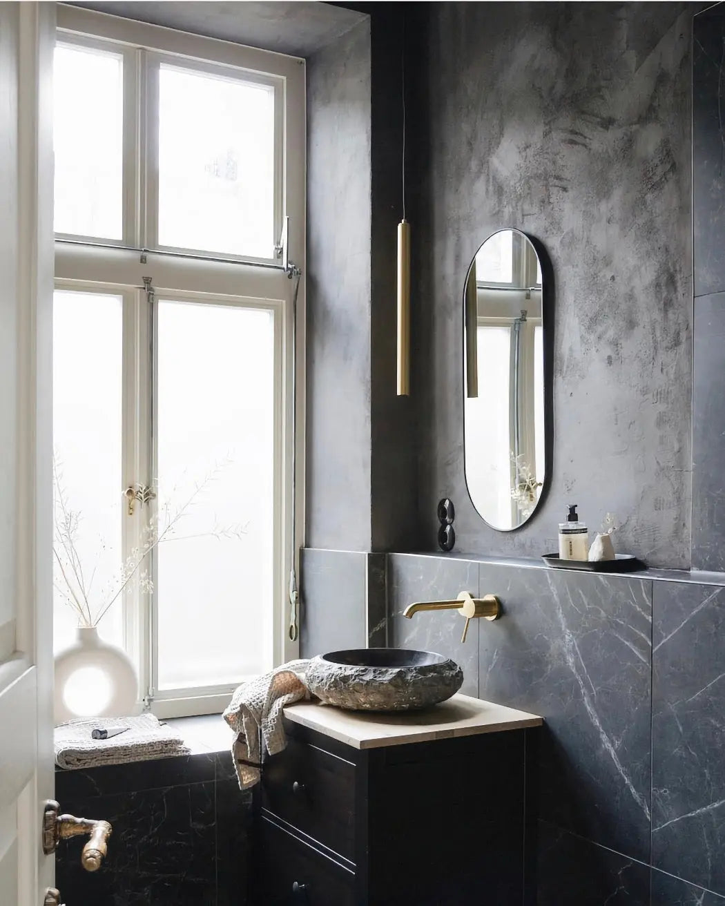 Na stěně jeho tmavé minerální tóny vytvářejí výrazné a atmosférické pozadí, dodávají prostoru hloubku a kultivovaný, současný charakter. Tento odstín je součástí atmosférické barevné palety, která proměnila bar ve Fremantle v Austrálii.
