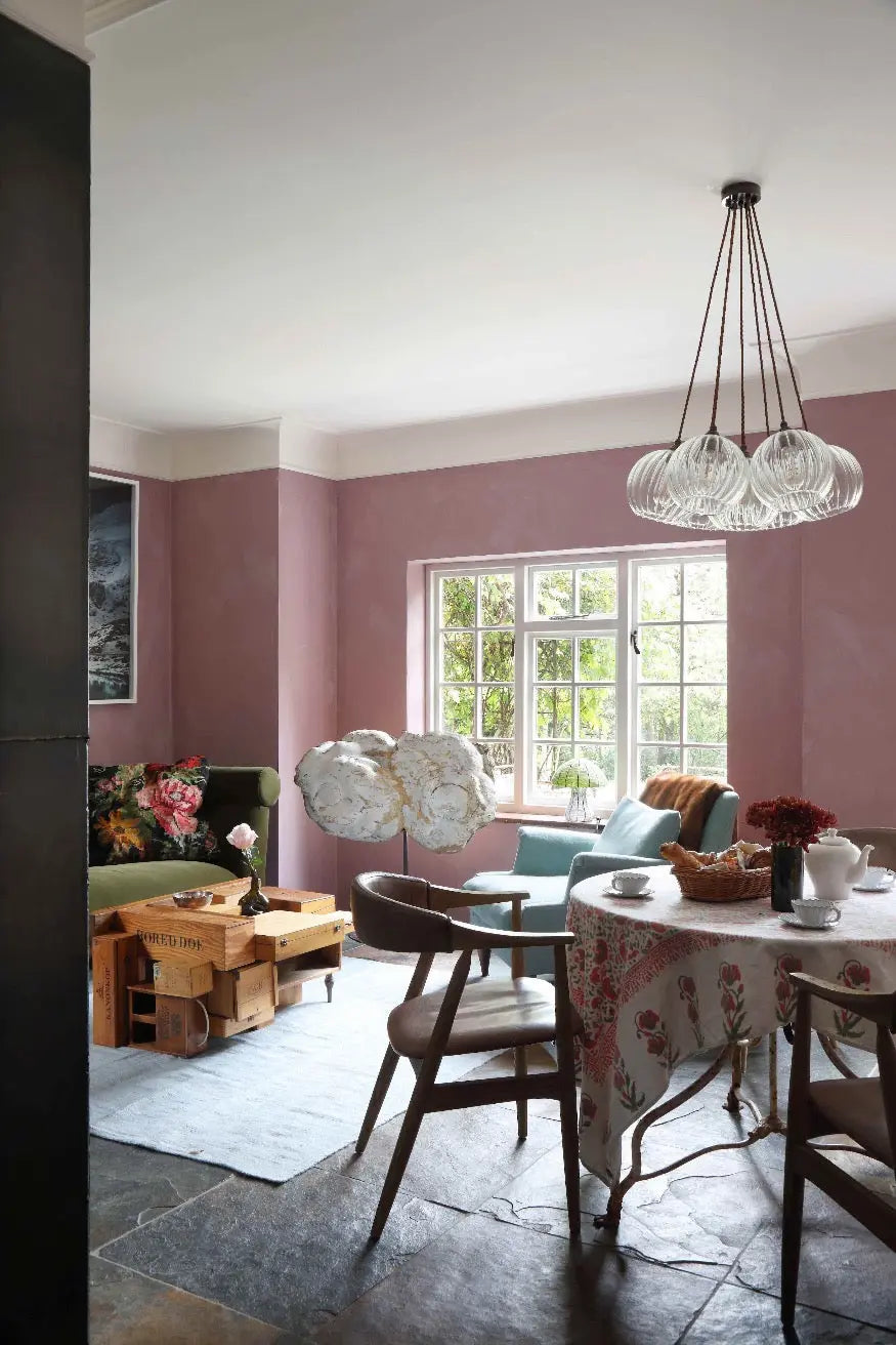 Na stěně působí výrazněji růžově než na vzorníku, čímž dodává prostoru teplo a eleganci.