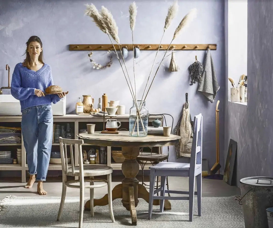 Lake is a faded dusky blue limewash with a gentle mauve undertone, creating a soothing and intimate atmosphere — perfect for a bedroom or calm retreat. A lighter alternative is Iris, while darker options include Hortensia and Foxglove.